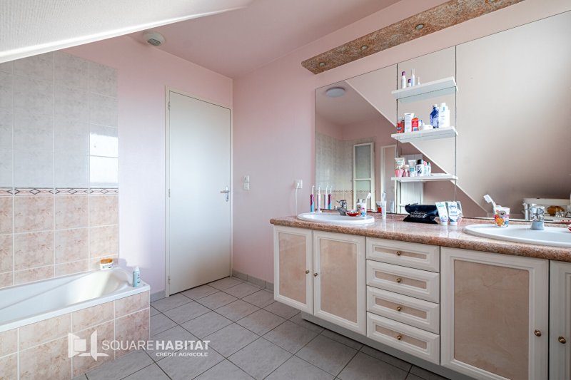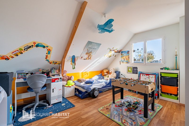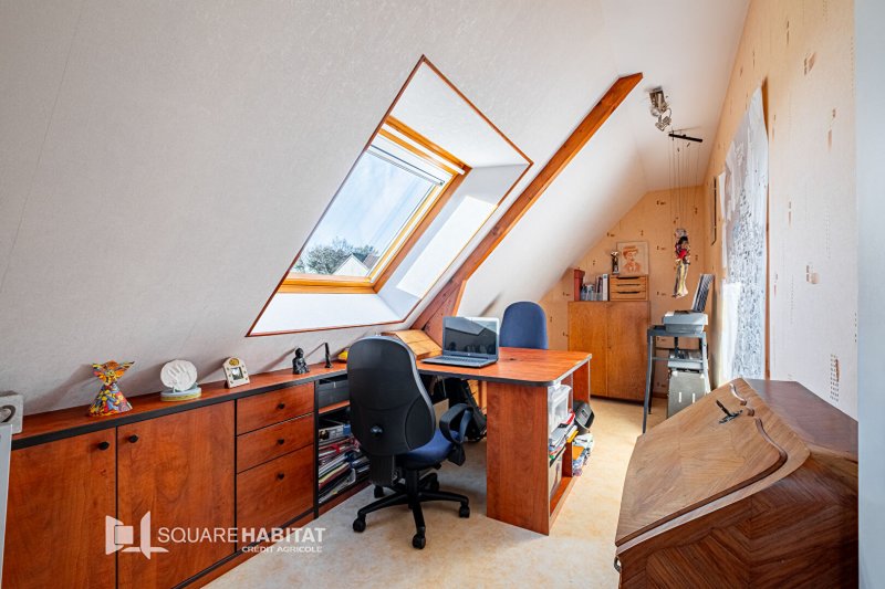 À l'étage, un palier dessert trois chambres (15m², 16.5 m², 15.5m² au sol) dont deux avec placards intégrés, un bureau avec rangements (13 m² au sol), une salle de bains et un WC indépendant.