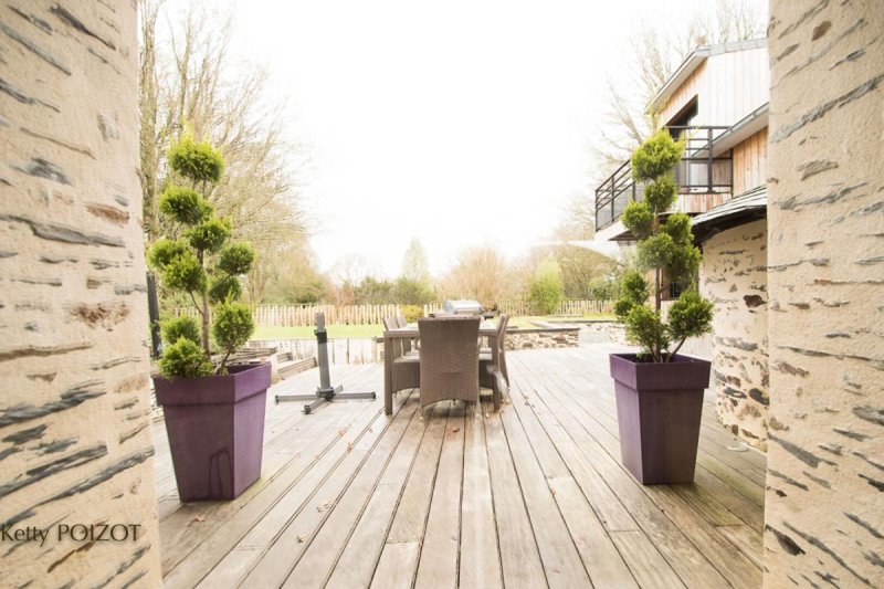 Les extérieurs subliment la propriété avec une magnifique terrasse bois de 45 m² exposée plein sud, un potager soigné, une mare naturelle, un puits, et une superbe cabane dans les arbres, véritable écrin de poésie.