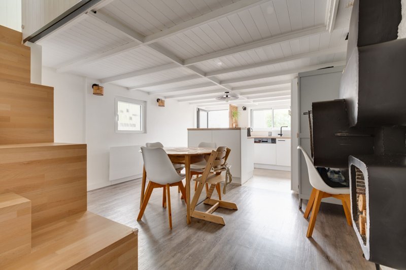 une cuisine conviviale ouverte sur une salle à manger chaleureuse agrémentée d'une cheminée, idéale pour vos soirées d'hiver. Le salon complète cet espace de vie confortable et lumineux.