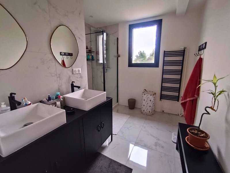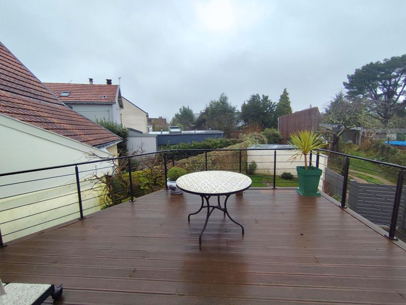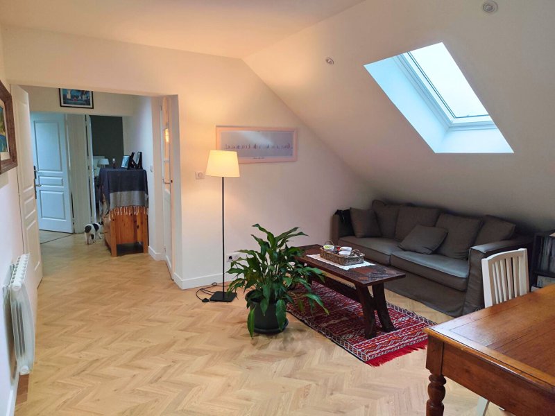 A l'étage, pièce de vie lumineuse avec salon, salle à manger et cuisine équipée ouverte donnant sur une terrasse avec accès au jardin, deux chambres, salle d'eau, WC suspendu.