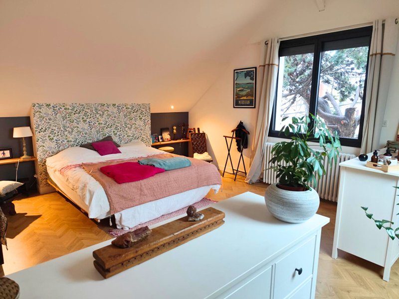 Au deuxième, grand palier desservant trois chambres, espace buanderie, salle de bains avec douche et baignoire, toilettes séparés.