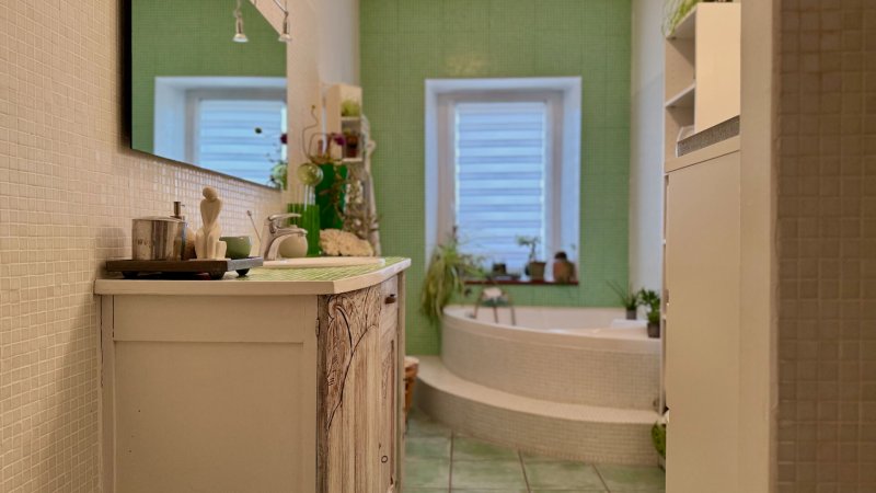 1er étage : quatre chambres (dont une avec une salle d'eau privative), une salle de bain avec baignoire et douche, un deuxième WC, une buanderie et un balcon accessible depuis une chambre donnant sur le jardin.