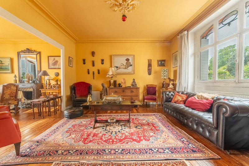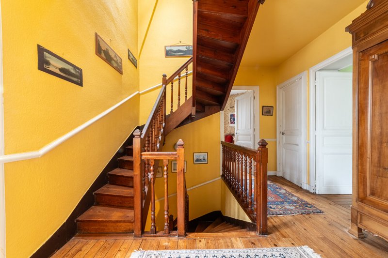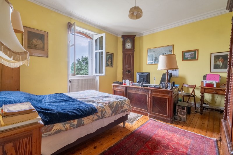 Entrée, vaste réception sur parquets avec cheminée donnant sur terrasse et jardin, 5 chambres, bureau, salle de bains, possible salle d'eau, lingerie et 2 WC.