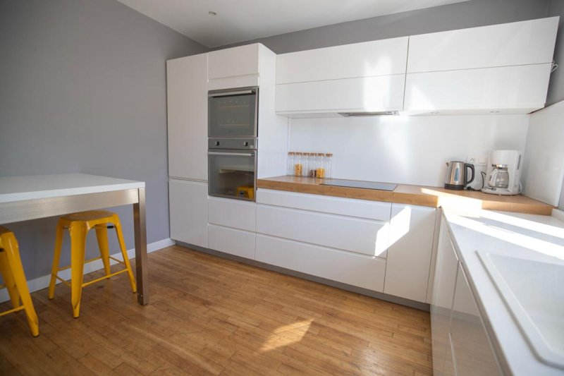 A l'étage, la maison dévoile une magnifique pièce de vie baignée de lumière, sublimée par de superbes parquets en bois. La cuisine haut de gamme, aménagée et entièrement équipée, s'intègre parfaitement à cet espace convivial. Une chambre complète ce niveau.