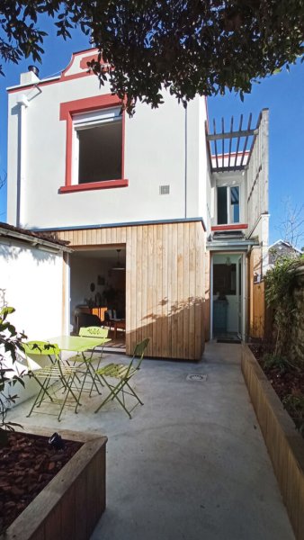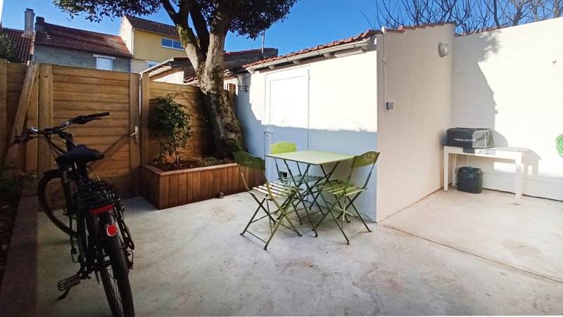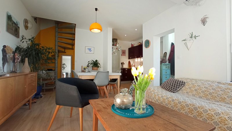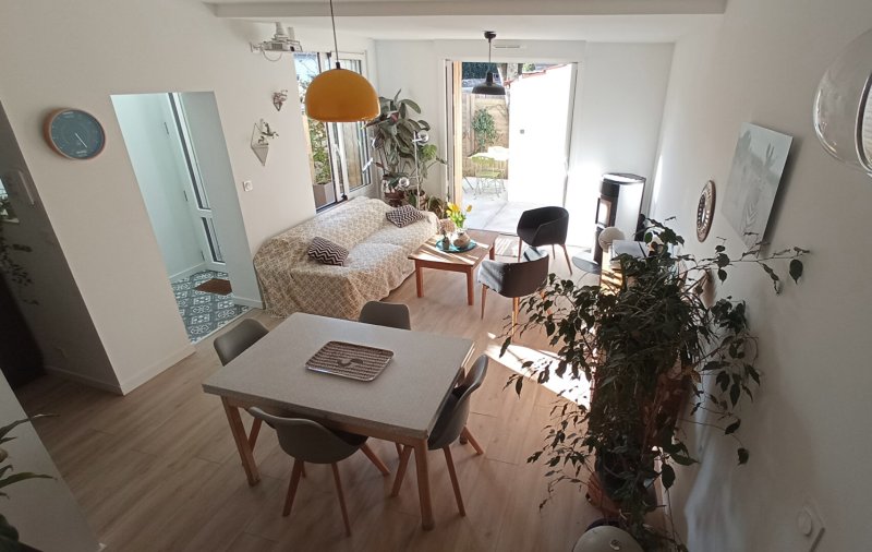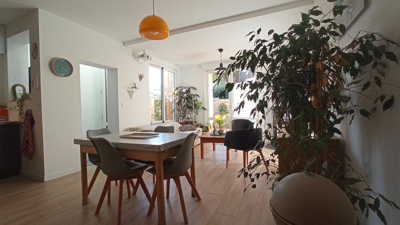 PLESSIS TISON Au calme, charmante maison plein Sud, rénovée, comprenant au rez-de-chaussée : entrée, séjour sur terrasse, cuisine semi-ouverte aménagée et équipée, toilettes.