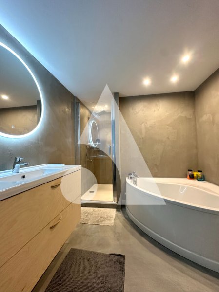 Une vaste entrée vous permettra d'accéder à un escalier qui dessert à l'étage un spacieux salon-séjour particulièrement lumineux avec coin bureau, ainsi qu'une cuisine entièrement équipée et aménagée.