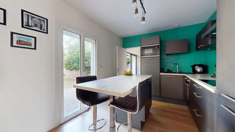 Elle se compose d'un grande entrée desservant une grande pièce de vie traversante avec cuisine ouverte de plus de 40 m² donnant accès au jardin. Un espace buanderie et l'accès au garage attenant. Vous disposez également d'une chambre au rez-de-chaussée et une salle d'eau attenante pour une vie de plain-pied. A l'étage, deux chambres, une salle de bains avec W.C.