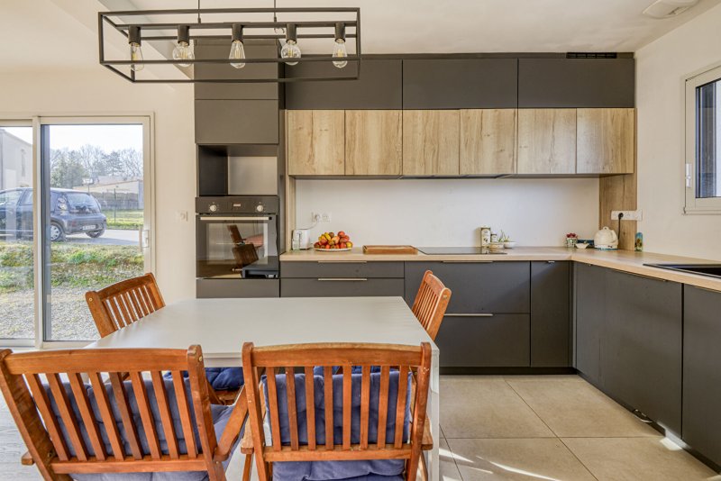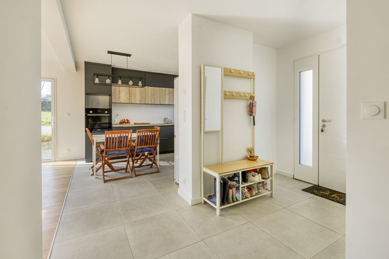 Au rez-de-chaussée, l'entrée mène à un espace de vie lumineux et traversant de 40 m², comprenant un salon-séjour et une cuisine moderne. Une chambre complète ce niveau, ainsi qu'une arrière-cuisine, un WC et un garage, qui peut être transformé en une cinquième chambre.