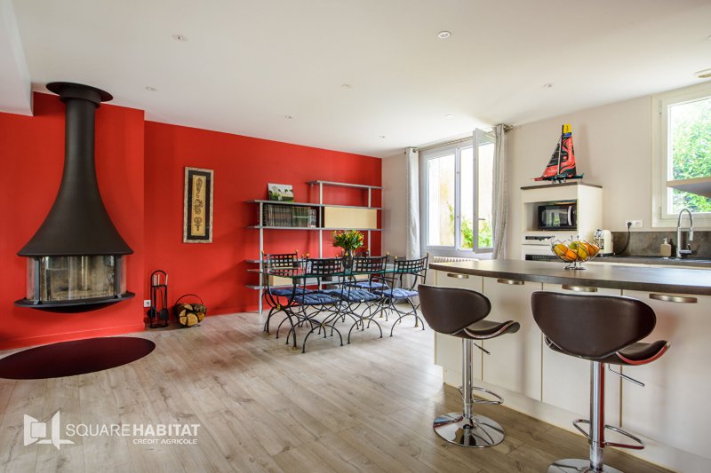 Au premier étage, vous profiterez d'une grande pièce à vivre de 58m² traversante et lumineuse avec cheminée et une cuisine ouverte aménagée et équipée, un espace bureau ou chambre d'appoint, et véranda donnant sur l'espace extérieure sans vis à vis.