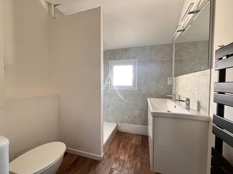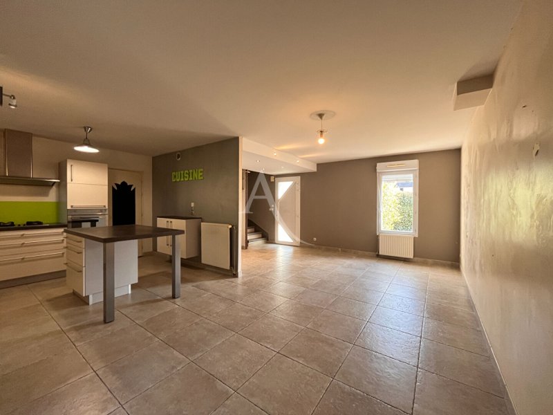 Elle offre un vaste espace de vie de plus de 60 m², comprenant une belle cuisine aménagée et équipée (plaque, four, hotte, lave-vaisselle) avec îlot central, une grande buanderie attenante et un WC séparé.