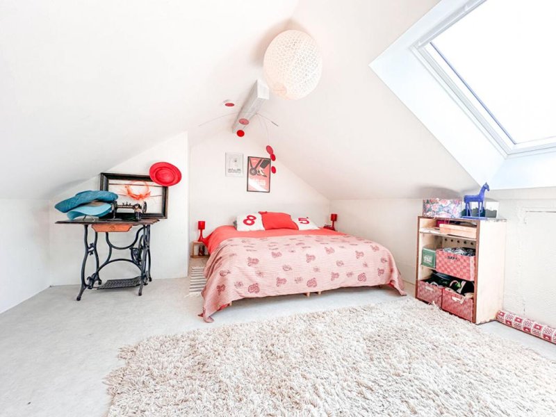A l'étage, un parquet ancien apporte un cachet indéniable. Le palier dessert une salle de bains avec WC, un dressing attenant à une première chambre, ainsi qu'une seconde chambre de 17m². Les combles ont été aménagés pour offrir une grande chambre de 25 m² au sol, avec rangements intégrés dans les mansardes.