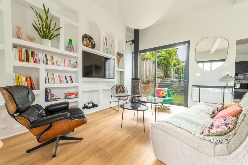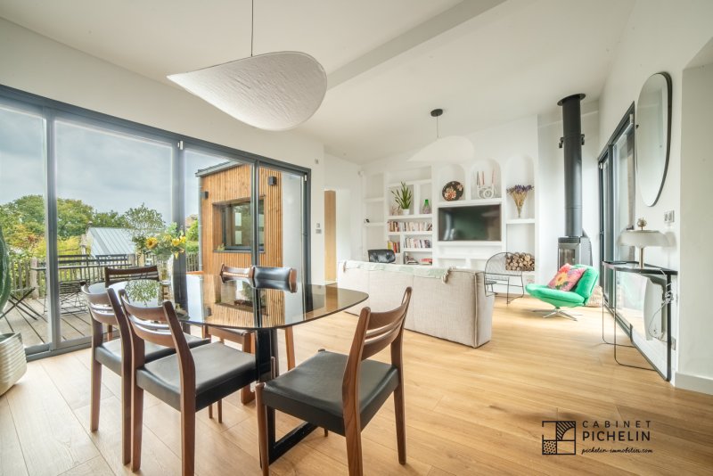 Ce bien de grande qualité baigné de soleil se compose de : Entrée avec rangements sur mesure, vaste réception avec bibliothèque encastrée et poêle donnant sur terrasse et jardin à l'abri des regards, cuisine équipée ouverte, 3 chambres, salle de bains et WC.