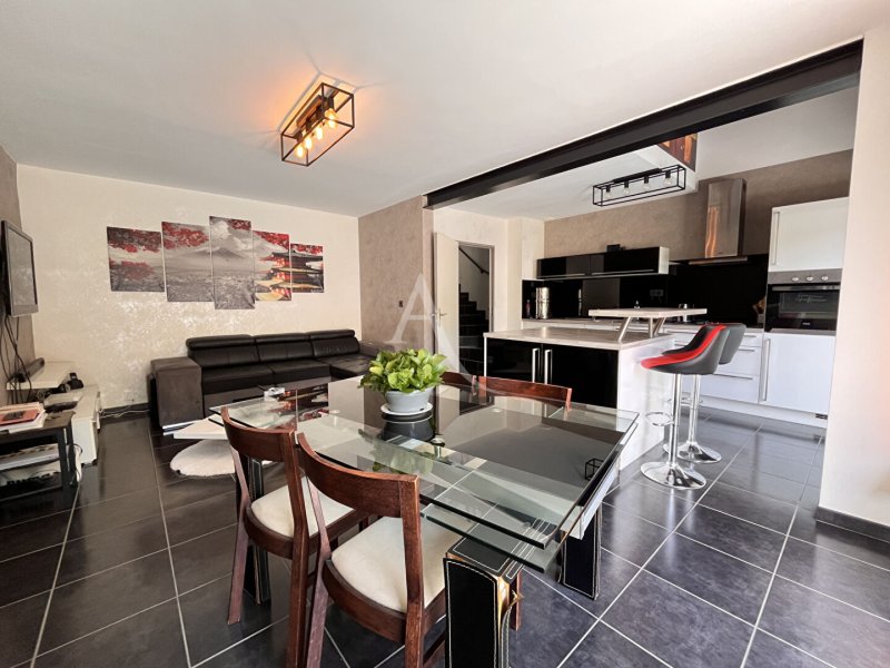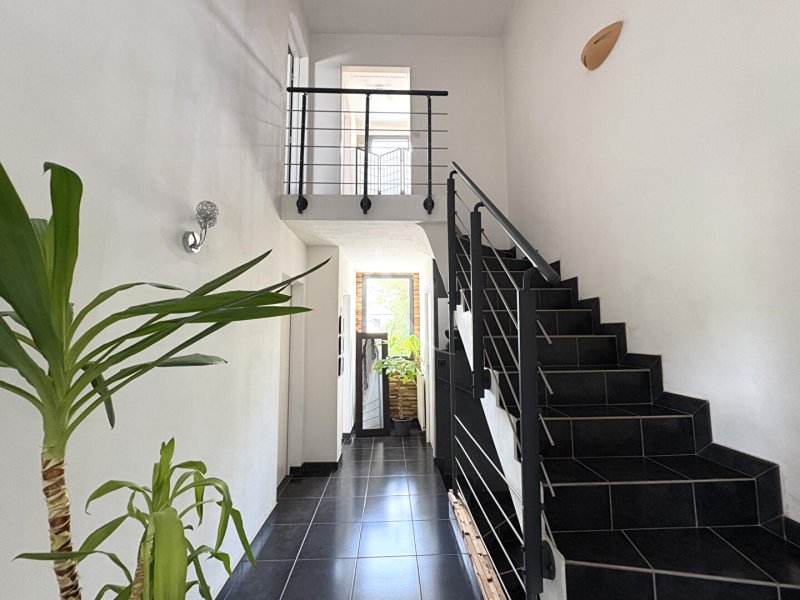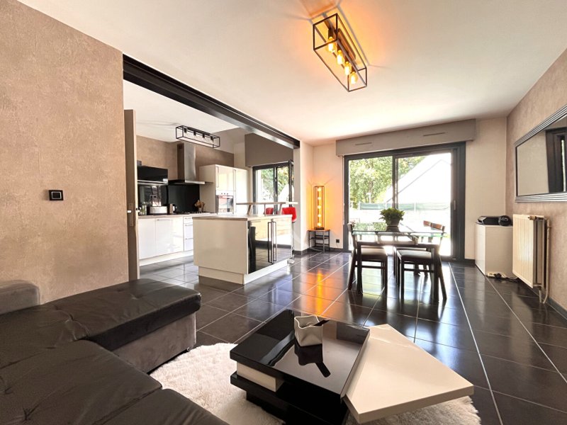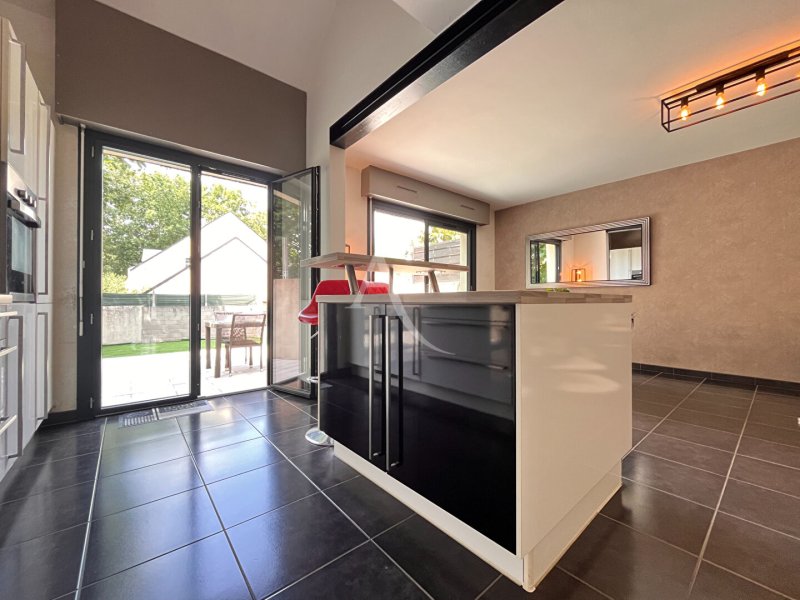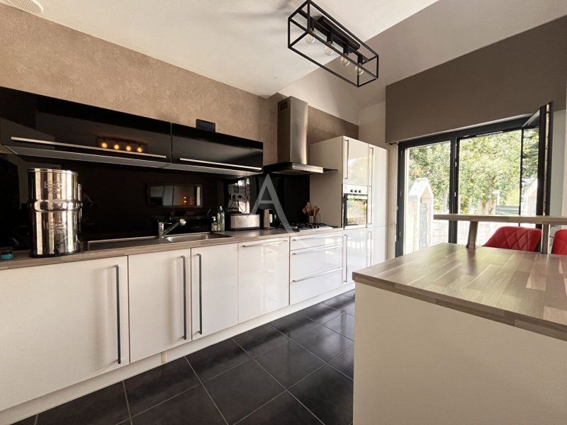 Au rez-de-chaussée, un bel espace de vie baigné de lumière vous accueille avec une cuisine contemporaine, entièrement aménagée et équipée, dotée d'un îlot central convivial, l'ensemble tourné vers son jardin.