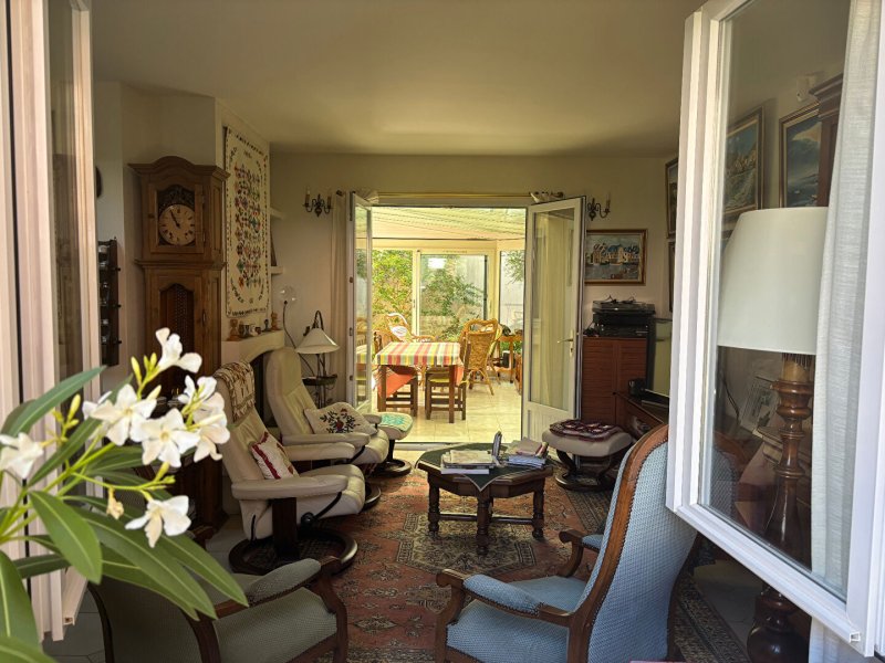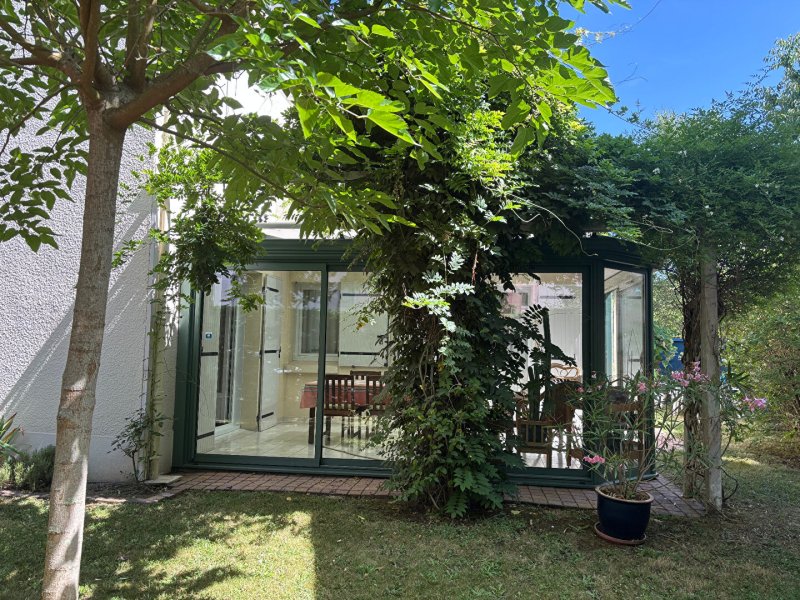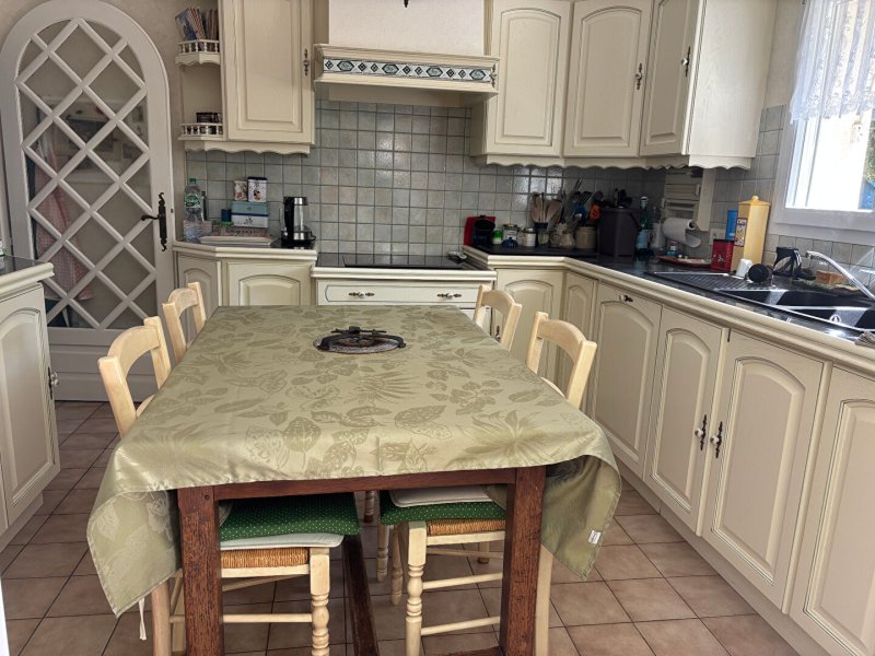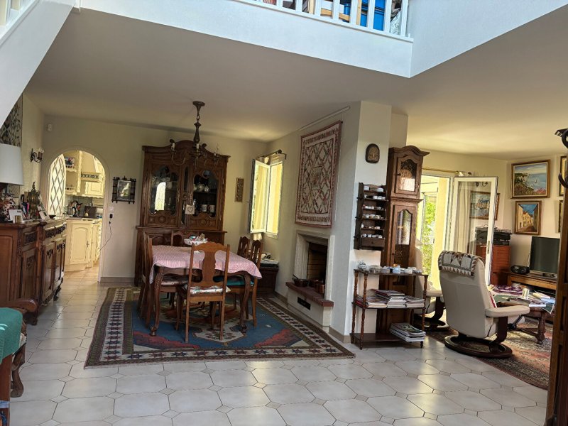 Maison des années 90 lumineuse et au calme comprenant : entrée cathédrale, double séjour avec cheminée insert traversant, cuisine meublée et équipée, ensemble donnant sur véranda, chambres et salle d'eau, atelier et garage.