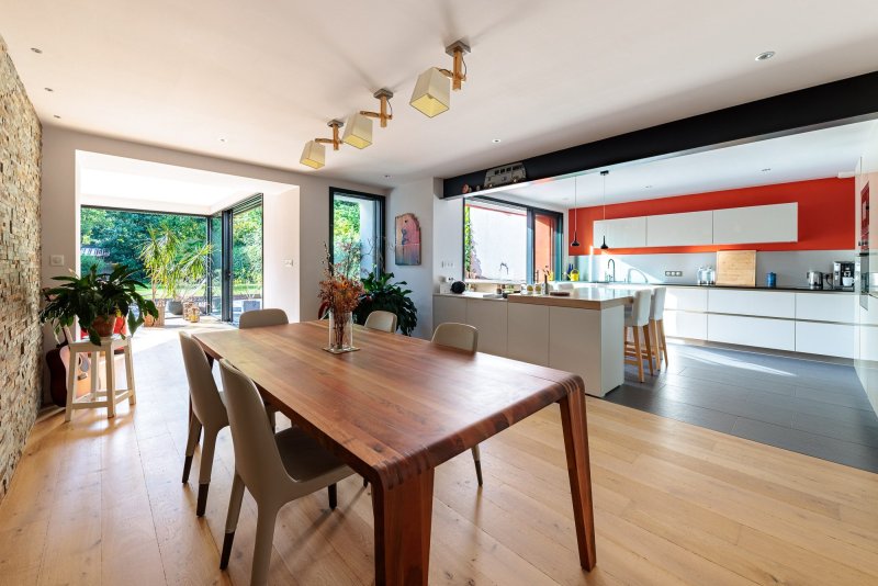 Exclusivité Rond-Point de Vannes / Sainte-Thérèse Implantée sur une belle parcelle de 513 m² exposée plein Sud, cette maison d'architecte familiale séduit par ses volumes, sa luminosité et la qualité de ses prestations. De plain-pied sur la terrasse et le jardin, la maison offre une spacieuse double réception (cheminée) baignée de lumière, ouverte sur un jardin paysagé soigneusement entretenu. La cuisine contemporaine, conviviale et fonctionnelle, profite elle aussi d'une agréable vue sur l'extérieur. Le premier étage accueille une suite parentale donnant sur le jardin, deux chambres supplémentaires ainsi qu'un bureau. Au deuxième étage, vous découvrirez deux autres chambres et une vaste salle de jeux, idéale pour une famille. Les espaces annexes complètent parfaitement l'ensemble : arrière-cuisine, lingerie et grand double garage. Maison confortable et élégante, offrant une excellente qualité de vie, à proximité immédiate des commerces et des transports. Terrain piscinable. Honoraires inclus de 4% TTC à la charge de l'acquéreur. Prix hors honoraires 1 200 000 . Classe énergie C, Classe climat C Montant moyen estimé des dépenses annuelles d'énergie pour un usage standard, établi à partir des prix de l'énergie de l'année 2021 : entre 1758.00 et 2378.00 . Les informations sur les risques auxquels ce bien est exposé sont disponibles sur le site Géorisques : georisques.gouv.fr.