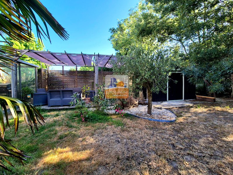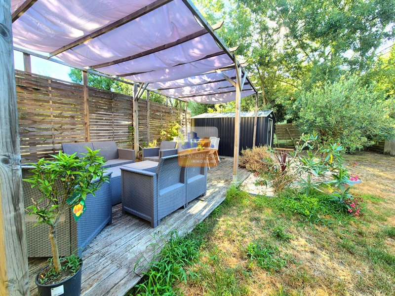 À l'extérieur, une terrasse complète l'espace jardin, ainsi qu'un petit cabanon.