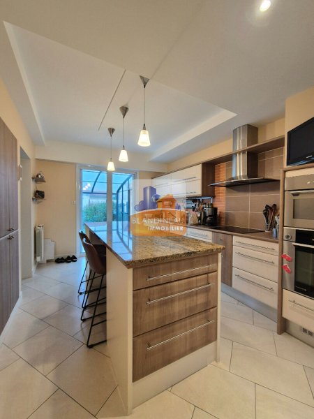 La cuisine aménagée et équipée, dotée d'un îlot central, offre un espace convivial et fonctionnel, complété par une arrière-cuisine / buanderie.