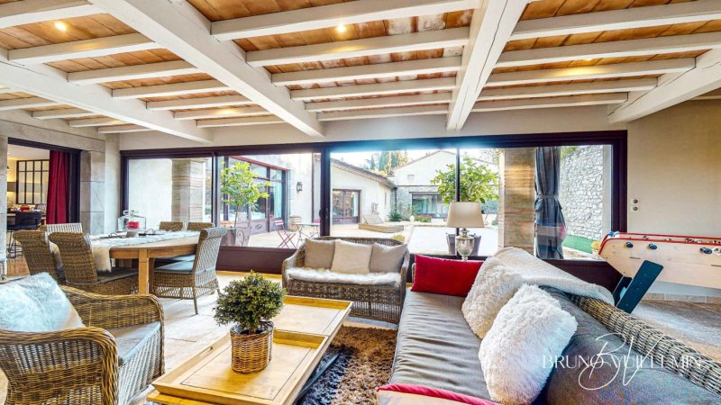 Elle propose 403m² de surface habitable sur un terrain clos et sans vis-à-vis de 956m² Les différentes parties habitables, pièces de réception, salle de sports et patio encadrent une piscine coque 10.00m x 4.00m, traitement au chlore, sécurisée par un volet roulant électrique. Une cuve de récupération enterrée met à disposition 15.000 litres d'eau pluviale pour les travaux de jardin et la piscine.