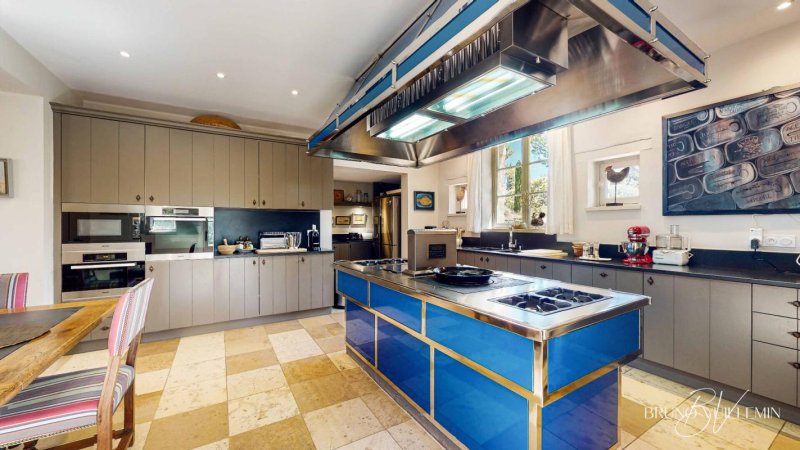 / Rez-de-Chaussée : * Salon de réception 62m² avec sa cheminée décorative * Salle à manger avec sa cheminée insert * Cuisine ouverte meublée et équipée, notamment, de matériel de cuisson professionnel réputé ADISA Barcelone * Arrière-cuisine meublée et équipée * WC invités * Suite composée d'une chambre et de sa salle d'eau
