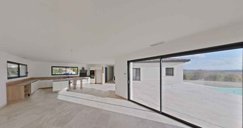 Carcassonne 15 mn ouest. Au calme, villa contemporaine neuve dans secteur résidentiel sur 3000 m2 environ avec vue panoramique sur les Pyrénées et la campagne. Séjour 60 m² ouvert sur grande cuisine équipée avec électroménager complet; 4 chambres dont une suite avec salle d'eau et placard dressing, 2 wc suspendus, salle d'eau, cellier. Double garage isolé avec portes automatiques. Très belles prestations: pierre marbre travertin sur toute la maison et la terrasse, baies à galandage, volets roulants électriques, pompe à chaleur avec réglage chaud/froid avec réglage individuel dans chaque pièce, chauffe-eau thermodynamique, portail automatique. Piscine avec grande plage pierre sans vis à vis et vue imprenable. Garantie décennale. prix 530 000 euros honoraires inclus à la charge de l'acquéreur. Prix hors honoraires 500 000 euros.