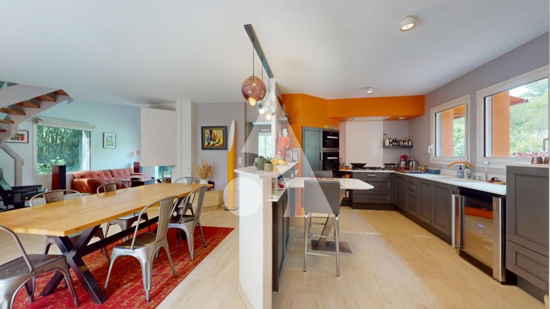Au rez-de-chaussée, l'entrée ouvre sur une lumineuse pièce de vie traversante avec plafond cathédrale ainsi que sa cuisine ouverte aménagée et équipée haut de gamme sur mesure.
