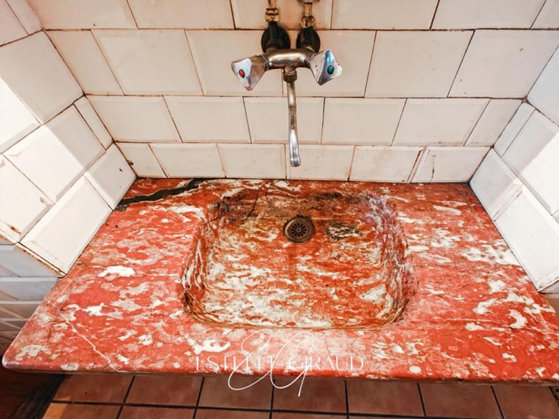 au RDC : deux pièces de vie, dont un séjour et une cuisine avec une cheminée à foyer ouvert et un évier en Marbre Rose de Caunes-Minervois.