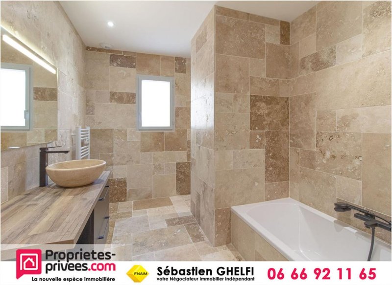 belle maison contemporaine de plain pied- grande salle de vie d'environ 60 m² avec cuisine entièrement équipée- 3 chambres -wc - salle de bain avec baignoire et douche -cellier -et terrasse sur parcelle de 460 m².