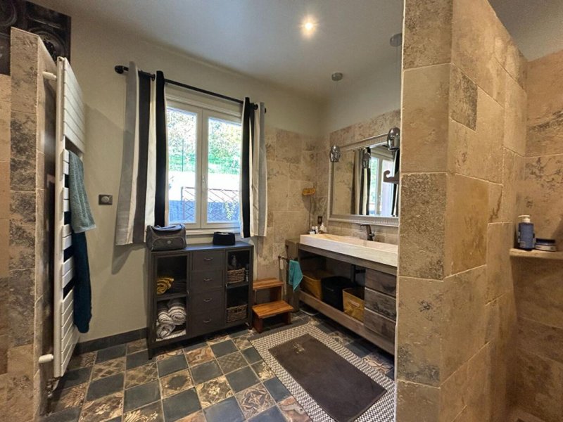 A l'extérieur, vous profiterez d'un terrain clos et paysager de 895 m² comprenant une grande terrasse, un spa de nage aménagé de 5,50 m sur 2,40 m et un terrain de boules, parfaits pour vos moments de détente en plein air.
