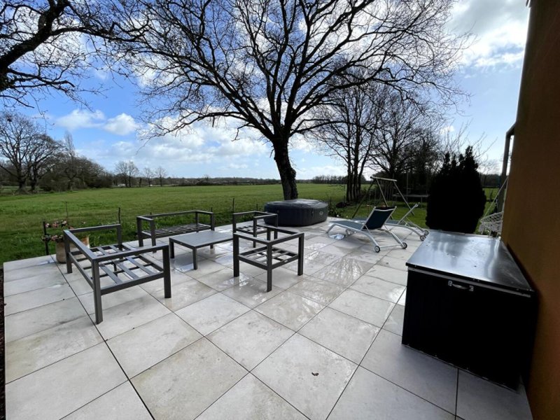 A l'extérieur, vous profiterez d'une superbe terrasse d'environ 150 m², principalement orientée plein sud, avec une très belle vue dégagée sur la campagne, sans vis-à-vis. Un cadre idéal pour profiter des beaux jours en toute tranquillité.