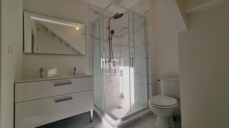 Elle comprend au rez-de-chaussée un spacieux séjour avec cuisine ouverte aménagée et équipée (plaque, hotte) , le tout donnant sur le jardin exposé sud/ouest. Toujours au rez de chaussée un dégagement desservant une chambre de 12m² donnant sur jardin et une salle d'eau confortable avec WC.