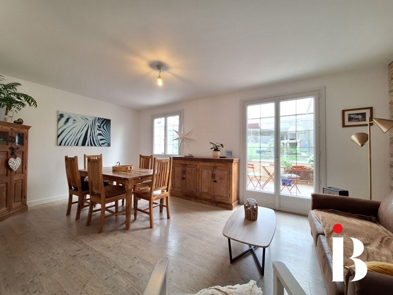 COUERON BOURG Originalité et aménagement soigné sont les atouts de cette maison à la décoration très tendance. Elle vous offre une pièce de vie baignée de lumière et prolongée par une véranda donnant sur un joli jardin arboré et sans vis à vis. 3 chambres, salle de bains et garage. Proche écoles et commerces.
