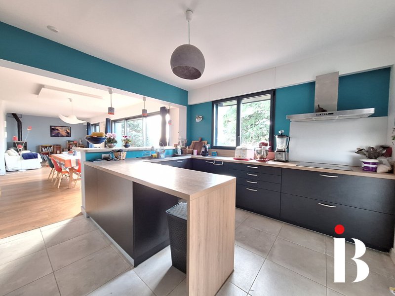La vaste pièce de vie avec poêle s'ouvre sur une cuisine moderne aménagée et équipée, idéale pour les moments de convivialité.