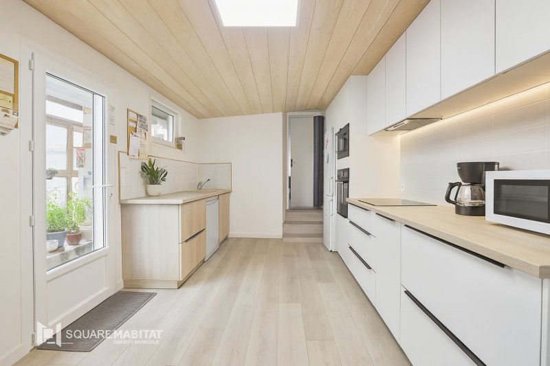 - Au rez-de-chaussée : une cuisine aménagée, un salon avec insert, une salle d'eau, un WC, ainsi qu'une chambre d'environ 18 m².