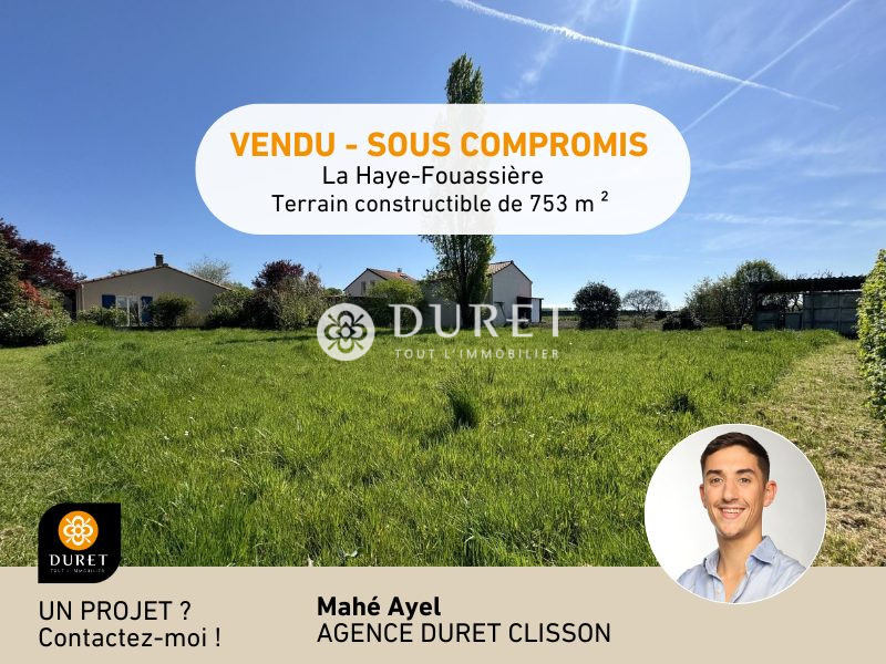 Sous compromis : « Vos agences DURET IMMOBILIER vous accueillent téléphoniquement du lundi au samedi de 8h00 à 19h00 sans interruption. » VENDU SOUS-COMPROMIS En exclusivité TERRAIN CONSTRUCTIBLE de 753. M², À LA HAIE-FOUASSIÈRE. Emplacement idéal ! Situé en second rideau, ce terrain offre calme et intimité tout en étant proche des commodités : À 5 min de la gare et du bourg de La Haie-Fouassière À 10 min de la gare de Vertou et du centre de Vertou À 12 min de la Porte de Vertou (Busway ligne 4) À 9 min du centre commercial de Basse-Goulaine Caractéristiques du terrain : Superficie : 753 m² environ (hors accès) Zonage : UAB (constructible) Façade : 22 mètres Profondeur : 30 mètres (hors accès) Exposition : Sud-Ouest Terrain plat, facile à aménager Entièrement clos ( reste côté sud du terrain à clôturer) Exposition faible au retrait/gonflement des argiles. Un cadre paisible et recherché, à visiter sans tarder ! Venez découvrir ce bien en prenant rendez-vous directement avec Mahé AYEL au 02 52 09 72 72 Honoraires inclus de 6.22% TTC à la charge de l'acquéreur. Prix hors honoraires 135 000 . Les informations sur les risques auxquels ce bien est exposé sont disponibles sur le site Géorisques : georisques.gouv.fr.